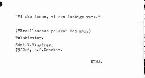//// f t //// "Vi ska dansa, vi ska lustiga vara.11 //// ("Excellensens polska" Med mel.) //// Polsktexter. = //// S dml.V.Vingåk er, ¦ //// 7922:6, s.2.Dencker. //// ULM A. I ////
