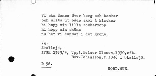 //// Ti ska dansa över berg och backar och slita ut både skor å klackar hi hopp min lille sockertopp hi hopp min sköna nu har vi dansat i det gröna. //// Tg. //// Skallsjö, //// IFG-H 2383/9, Uppt.Helmer Olsson, 1930,eft. //// ^ Edv.Johansson, f.I846 i Skallsjö. //// D 56. //// ---UOHD.läUS. ////