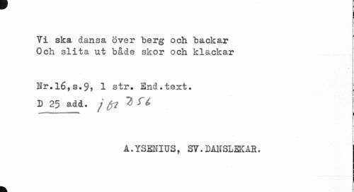 //// ¦ //// Ti ska dansa över berg och backar f //// B //// Och slita ut både skor och klackar //// i //// Nr.16,s.9, 1 str. End.text. //// D 25 add. j (yl 3 f é f //// 1= //// ' l //// t //// A.YSENIUS, SV.DANSLEKAR. //// k. ////