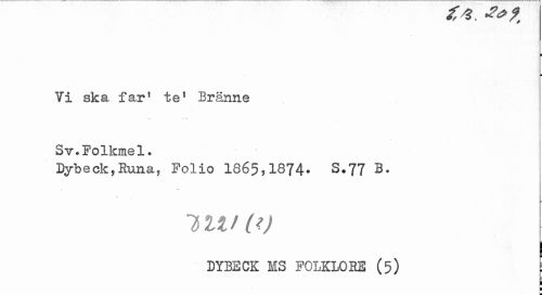 //// 6, . * f //// i ¦ //// Yi ska far1 te1 Bränne //// i //// Sv.Folkmel. //// Dybeck,Runa, Folio 1865,1874. S.77 B. //// IVIV //// DYBECK MS FOLKLORE (5) | //// P ////