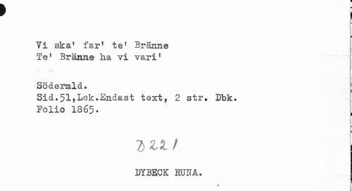 //// p i //// L //// ¦ //// --- //// i //// Yi ska1 far1 tef Bränne Te* Bränne ha vi vari1 //// • ti* ¦¦¦ . //// Södermld. //// Sid.Lek.Endast text, 2 str. Dbk. //// Polio 1865. //// i //// hi t //// DYBECK RUNA. ////