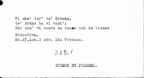 //// Ti ska1 farf te1 Bränne, te1 Bräne ha vi varif; //// i //// Där ska' vi hemta de rosar och de blader Södertörn, //// Nr*47>Lek.2 str, Ida Tretman. //// 2>i% t //// DYBECK SV.FOLKMEL. //// ... . . , . ' ... ...^å ////