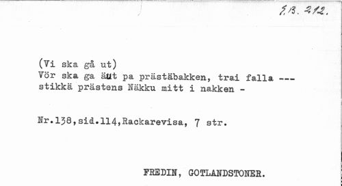 //// (Vi ska gå ut) //// Yör ska ga ätit pa prästäbakken, trai falla--- //// stikkä prästens Näkku mitt i nakken - //// Nr. 138, sid..ll4,Rackarevisa, 7 str. //// FRE DIN, GOTLANDSTONER. ////