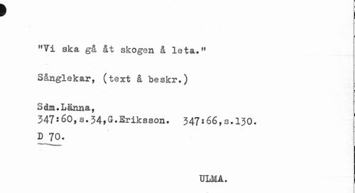 //// I //// "Vi ska gå åt skogen å leta.11 Sånglekar, (text å beskr.) //// Sdm.Länna, . //// 347:60,s.34,G.Eriksson. 347:66,s.130. //// D 70. //// IJLMÅ. ! ////