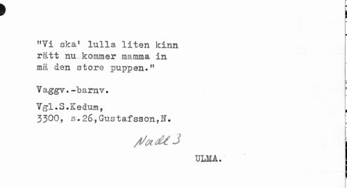 //// » I //// i //// "Vi ska! lulla liten kinn rätt nu kommer mamma in mä den store puppen." //// Vaggv. -"barnv. //// Vgl.S.Kedum, i //// 3300, s. 26, Gustafsson,U. //// U //// j/adtJ i //// ULMA. ////