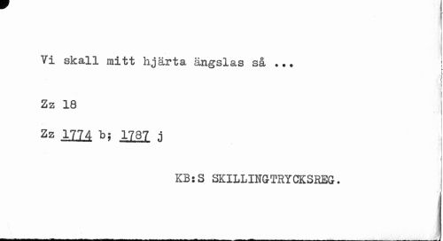 //// ¦ //// t I //// Vi skall mitt hjärta ängslas så ... //// ¦ i //// Zz 18 //// Zz 1774 b; 1737 j //// KB:S SKILLINGTRYCKSREG. ////