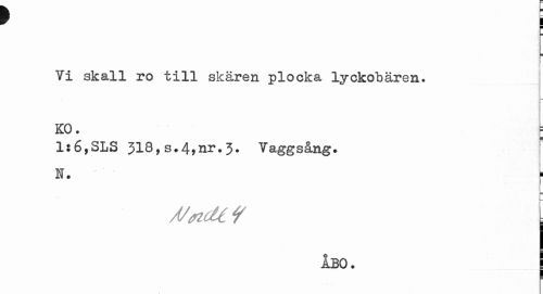 //// f //// ¦ //// Vi skall ro till skären plocka lyckotåren. //// KO. ¦ //// 1:6,SLS 318,s.4,nr.3. Vaggsång. //// N. ¦ //// J/#ÖU f //// ÅBO. ////