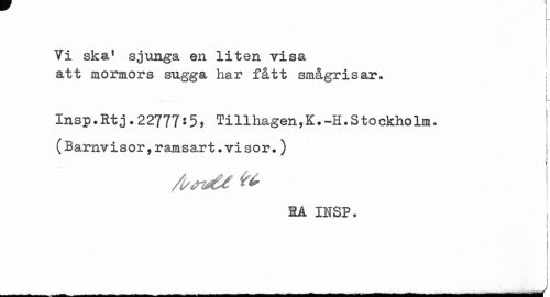 //// Vi ska1 sjunga en liten visa //// att mormors sugga har fått smågrisar. ; //// - //// r //// Insp.Rtj.22777*5» Tillhagen,K.-h.Stockholm. ! //// i //// (Barnvisor,ramsart.visor.) j //// i //// HA ihsp. | //// \ //// ! //// { //// ! ////