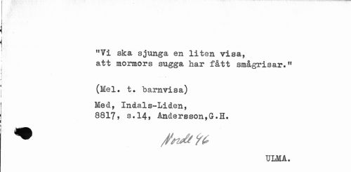 //// "Vi ska sjunga en liten visa, //// att mormors sugga har fått smågrisar." //// » //// (Mel. t. barnvisa) Med, Indals-Liden, //// 8817, s.14, Andersson,G.H. //// ULMA. ////