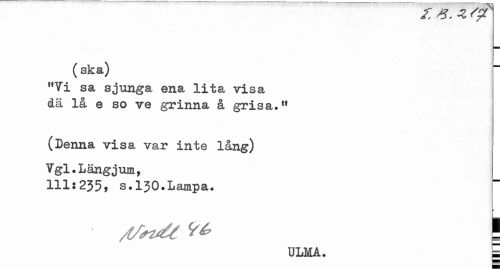 //// (ska) //// "Vi sa sjunga ena lita visa dä lå e so ve grinna å grisa." //// (Denna visa var inte lång) //// Vgl.Längjum, //// 111:235» s.130.Lampa» //// r //// I //// ULMA. | ////