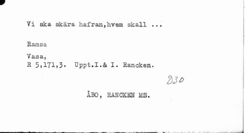 //// Yi ska skära hafran9hrem skall .. • //// Ramsa Vasa, //// R 5,171,3. Uppt.I.& I. Ranckea. //// a?* //// ÅBO, RANCKEN MS. ////