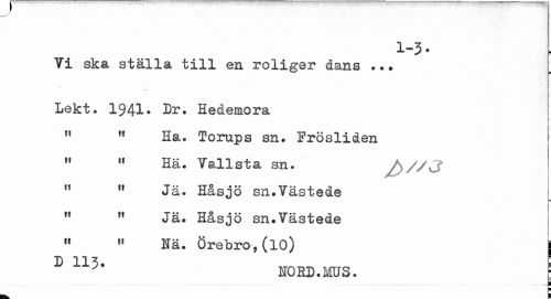 //// 1-3. //// Vi ska ställa till en roliger dans ... Lekt. //// 1941• Dr. Hedemora 11 Ha. Torups sn. Frosliden //// M " Hä. Y&llsta sn. rf ,f Jä. Håsjö sn.Yästede ff Jä. Håsjö sn.Västede //// " « Nä. Örebro, (10) j //// ¦ //// 115, NORD.MUS. 1 //// ! ////