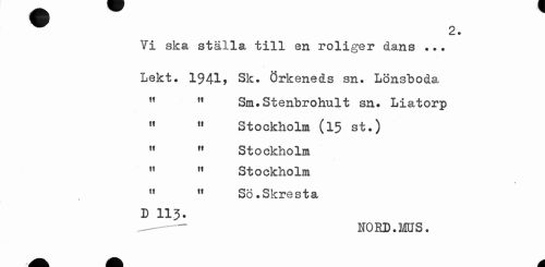 //// Vi ska ställa till en roliger dans ... //// Lekt. 1941> Sk. Örkeneds sn. Lönsboda //// 11 " Sm.Stenbrohult sn. Liatorp //// " " Stockholm (15 st.) //// " " Stockholm //// " " Stockholm //// " •• Sö.Skresta //// D 113. //// -—---NO ED. ms. //// ^ A ////