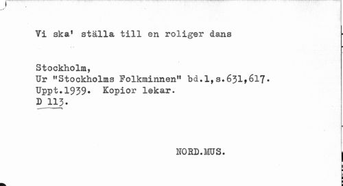 //// Vi ska ställa till en roliger dans ... r //// i //// Stockholm, //// Ur "Stockholms Folkminnen" bd.l,s.631*617* Uppt.1939* Kopior lekar. D 113. //// NORD.MUS. | //// ¦ ////