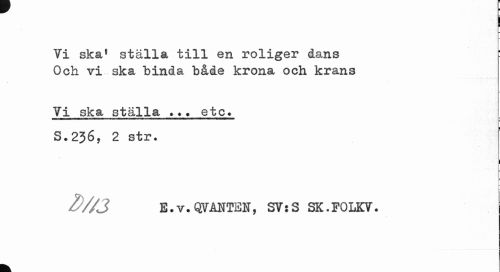 //// i //// i- //// Vi ska1 ställa till en roliger dans Och vi ska binda både krona och krans //// Vi ska ställa . ?? etc. //// F > //// S.236, 2 str. //// f B //// E.v.QVÅNTSN, SVjS SK.FOLKV. ////