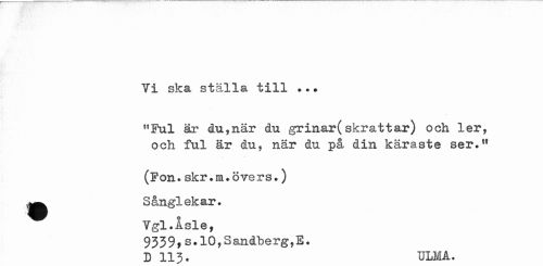 //// Yi ska ställa till ..* //// "Ful är du,när du grinar(skrattar) och ler, och ful är du, när du på din käraste ser.11 //// (Fon. skr.rruövers.) //// •Sånglekar. //// i //// Vgl.Asle, //// 9339,s.10,Sandberg,E. //// D 113. ULM A. ////