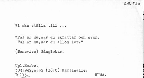 //// ^ 5 . //// i //// Ti ska ställa till ?.• //// "Ful är du,när du skrattar och svär, Ful är du,när du allom ler." //// (Dansvisa) Sånglekar. //// Upl.Harbo, g //// 303:942,s.32 (l6:0) Martinelle. ! //// D 113._ ULMA. j ////