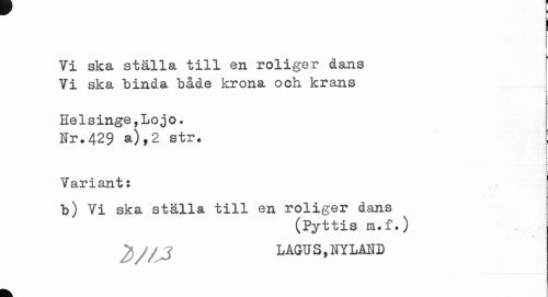 //// ^ R //// L //// r- //// I //// ¦ //// Vi ska ställa till en roliger dans Vi ska "binda både krona och krans //// Helsinge,Lojo. //// Ir.429 a),2 str. ; //// Variant: //// b) Vi ska ställa till en roliger dans //// (Pyttis m.f•) //// 1, //// 2) A/J LAGUS,NYLAND ////