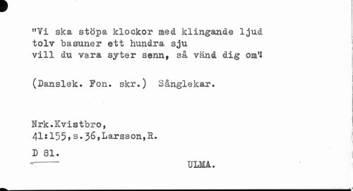 //// MVi ska stöpa klockor med klingande ljud //// tolv basuner ett hundra sju j //// vill du vara syter senn, så vänd dig om1! //// (Danslek. Fon. skr.) Sånglekar. //// i i //// i i i //// Nrk.Kvistbro, //// 41i 155,s.36,Larsson,R. //// D 81. //// t--ulma. //// - A A //// ___.9 ////