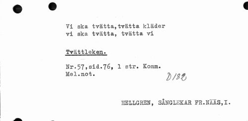 //// Vi ska tvätta,tvätta kläder vi ska tvätta, tvätta vi //// Tvättleken. //// Nr.57,sid.76, 1 str. Komm. Mel.not. //// KELLGREN, SÅNGLEKAR FR.NÄÄS,!. ////