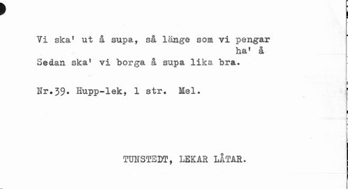 //// ' i //// ¦ //// m //// Vi ska1 ut å supa, så länge som vi pengar //// ha! å //// Sedan ska1 vi borga å supa lika bra. //// r - //// Ur.39. Hupp-lek, 1 str. Mel. : //// ! //// TUNST3DT, LEKAR LÅTAR. ////