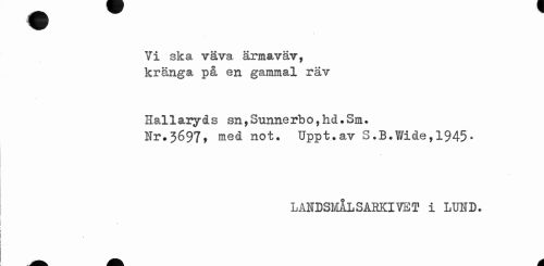 //// Vi ska väva ärmaväv, kränga på en gammal räv //// Hal1aryds sn,Sunnerb o,hd.Sm. //// Hr.3697, med not. Uppt.av S.B.Wide, 1945- //// LANDSMÅL SAKCI VE T i LUND. ////
