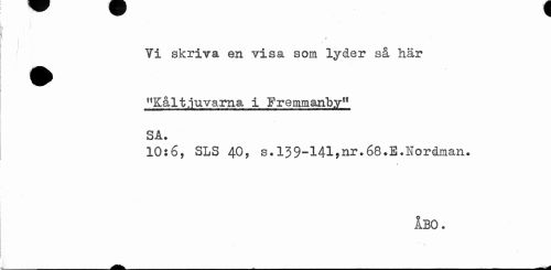 //// Ti skriva en visa som lyder så här //// "Kålt.juvarna i Fremmanby" SA. //// 10:6, SLS 40, s. 139-141,rir.68.E.Nordman. //// # //// ÅBO. ////