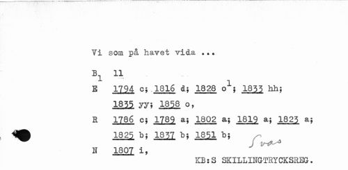 //// Vi som. på havet vida ... //// B1 11 //// E 1794 c;.1816 d; 1828 o1; 1835 hh; //// 1835 yy; 1858 o, R 1786 c; 1789 a; 1802 a; 1819 a; 1825 aj 1825 b; 1857 b$ 1851 bj - //// ^a //// / //// H 1807 i, //// KB:S SKILLINGTRYCKSREG. ////