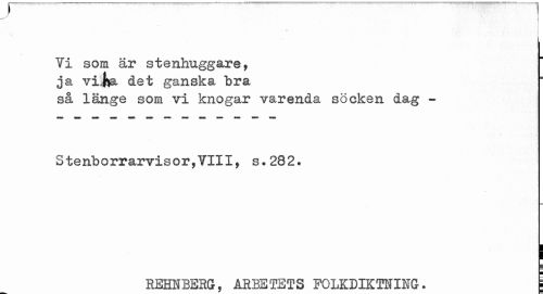 //// r //// rr //// Ti som är stenhuggare, ja vi,fca det ganska bra //// så länge som vi knogar varenda socken dag -Stenborrarvisor,TIII, s.282. //// ! //// REHNBERG, ARBETETS FOLKDIKTNING. g ////
