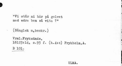 //// ? //// ¦ //// "Ti står ni här på golvet med edra ben så vita ?t! //// (Sånglek m,beskr.) ; //// Trml.Fryksände, , //// 18123*14, s.93 t. (h»4*o) Frykholm,Å. f //// — //// D 101. . //// ULMA. 1 ////