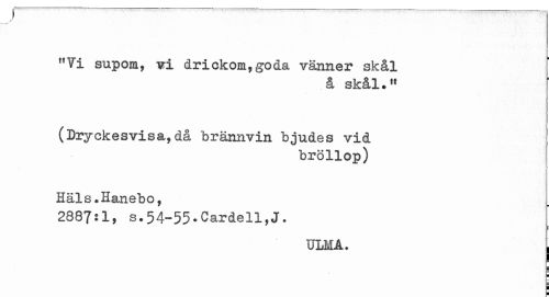 //// j //// HVi supom, vi drickom,goda vänner skål //// å skål•» //// (Dryckesvisa,då brännvin bjudes vid //// bröllop) //// Häls.Hanebo, //// 2887:1, s.54-55•Gardell,J. //// r //// TJIMA. , //// i ¦ //// I ////
