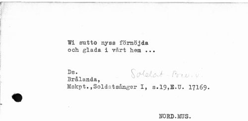 //// Wi sutto nyss förnöjda och glada i vårt hem ... //// Ds• k; . / t . . //// •n oi ^ ' : • ' ' 1 • //// Bralanda, //// Hskpt.,Soldatsånger I, s.19,E.U. I7I69. //// NO BD. 3®JS. ////