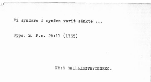 //// \J //// Yl syndare i synden varit sänkte ... Upps. Z. P.s. 26:11 (1735) //// KB:S SKILLINGTRYCKSREG. //// i ////