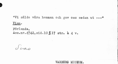 //// > //// i //// "Yi sålde våra hemman och gav oss sedan ut---,f //// Yl sa. Förlanda, //// Acc.nr. 4742, sid. 10'i(f, 17 str. a 4 v. //// 1 //// t //// cJ C^&^o //// VARBERG MUSEUM. ! ////