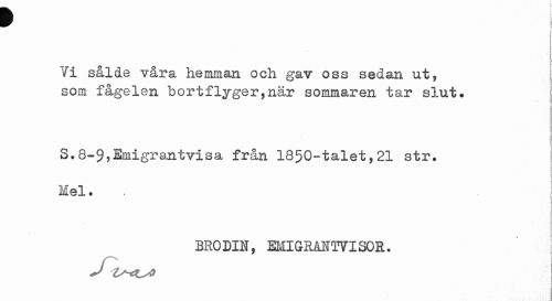 //// ¥ //// ¦ } l //// Yi sålde våra hemman och gav oss sedan ut, som fågelen bortflyger,när sommaren tar slut. //// S.8-9,Emigrantvisa från 1850-talet,21 str. Mel. //// BRODIN, EMIGRANTVTSOR. j //// J Z^LyO //// \ ////