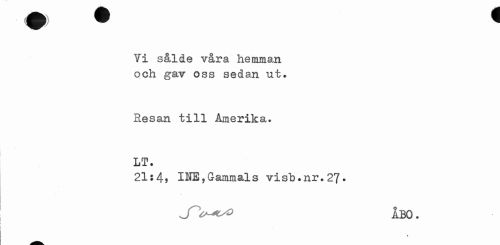 //// Yi sålde våra hemman och gav oss sedan ut. //// Resan till Amerika. LT. //// 21:45 INE,Gammals visb.nr.27. //// J^W^ ÅBO. //// » ////