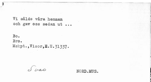//// f //// i //// "Vi sålde våra hemman //// i //// och gav oss sedan ut //// Bo. Bro. //// Mskpt.,¥isor,E.U.31337. //// = //// Cfl^o HORD.MUS. I ////