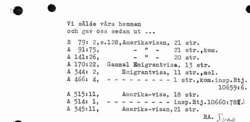 //// Yi sålde våra hemman och gav oss sedan ut ... //// B 79• 2,s.128,Amerikavisan, 21 str. A 91:75, - rt - 21 str. ,kom. //// A 141:26, - " - 20 str. //// A 170:22, Gammal Emigrantvisa, 15 str. A 344: 2, Emigrantvisa, 11 str.,mel. //// A 466: 4> - --.---i str. ,kom.insp.Rt j. //// 10659:6. //// A 515:Amerika-visa, 18 str. //// A 514: 1,--- - insp.Rtj. 10660:781.5 //// A 345:11, Amerika-visan,21 str. ////