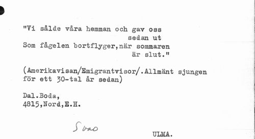 //// > //// "Yi sålde våra hemman och gav oss //// sedan ut //// Som fågelen bortflyger,när sommaren //// är slut." //// (Amerikavisan/Emigrantvisor/.Allmänt sjungen för ett 30~tal år sedan) //// Dal.Boda, 4815,Nord,E.H. //// J U^O //// ULMA. ////