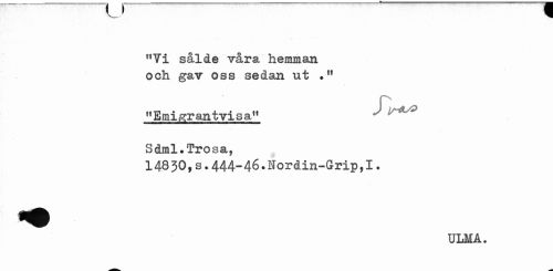 //// "Vi sålde våra hemman och gav oss sedan ut • " //// "Emigrantvisa" : ^ //// Sdml.Trosa, //// 14830,s.444-46.Nordin-Grip,I. //// ULMA. ////