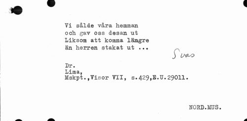 //// Vi sålde våra hemman och gav oss desan ut Liksom att komma längre än herren stakat ut ..• //// i U*0 //// Dr. Lima, //// Mskpt.,Visor VII, s.429,E.U.29011. //// NORD. MUS. ////