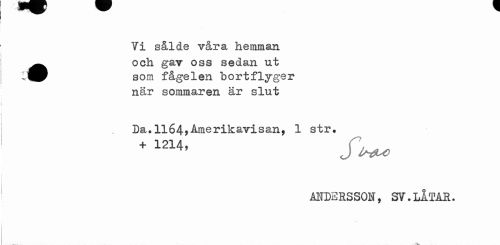 //// Yi sålde våra hemman //// ^^ och gav oss sedan ut //// som fågelen bort flyger när sommaren är slut //// I)a.ll64*Amerik&visan, 1 str. //// + 1214> f^u> //// AUDERSSON, SV.LÅTAR. //// > • ////