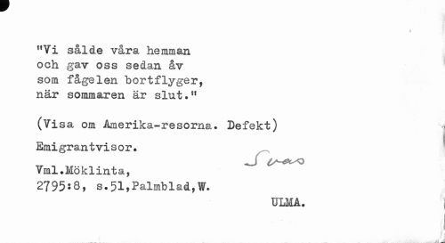 //// i //// !,Yi sålde våra hemman och gav oss sedan åv som fågelen bortflyger, när sommaren är slut.11 //// (Visa om Amerika-resorna. Defekt) 1 //// Emigrantvisor. //// Vml.Möklinta, //// 2795*8, s.51,Palmblad,W. //// ULMA. | //// y j //// / >/> ii ////