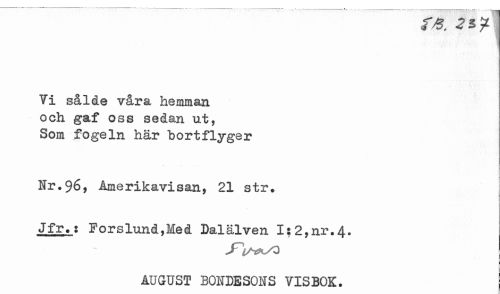 //// 2 sy» //// Vi sålde våra hemman och gaf oss sedan ut, Som fogeln här bortflyger //// Hr.96, Amerikavisan, 21 str. //// Jfr.: Forslund,Med Dalälven I:2,nr.4. ////