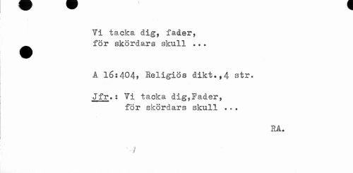 //// Vi tacka dig, fader, ^^ för skördars skull ... //// A 16:404, Religiös dikt»,4 str. //// Jfr.: Vi tacka dig,Fader, //// för skördars skull ... //// RA. //// i ////