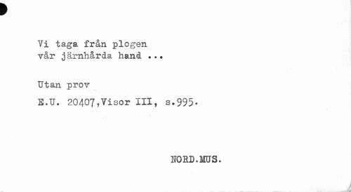 //// w //// Vi taga från plogen vår järnhårda hand ... //// Utan prov //// E.U. 20407,Visor III, S.995- //// HORD. MS. ////