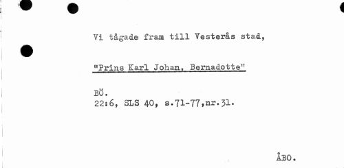 //// w W 1 //// Vi tågade fram till Yesterås stad, //// "Prins Karl Johan? Bernadotte" //// ...m wmmm -—...m ~ --- — --- //// BÖ. //// 22:6, SL3 40, s.71-77,nr.31. //// ÅBO. ////