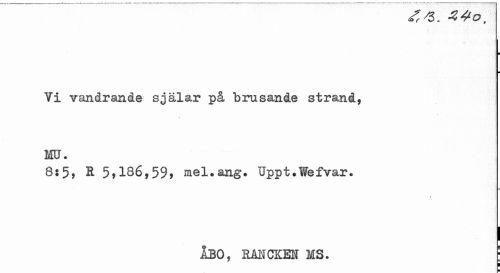 //// Sr K. ZVO, //// i //// Vi vandrande själar på brusande strand, MO". //// 8*5> R 5>186,59> mel.ang. Uppt. Wefvar. //// i //// i //// ÅBO, EMCKEST IS. 1 //// i ////