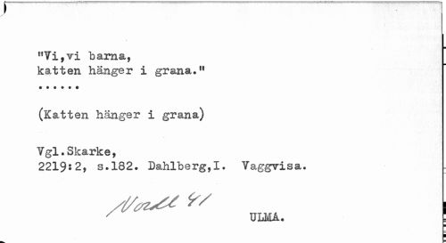 //// HVi,vi barna, //// katten hänger i grana.11 //// (Katten hänger i grana) //// Ygl.Skarke, //// 2219s2, s.182. Dahlberg,I. Vaggvisa. //// ^ s //// ULMA. j ////
