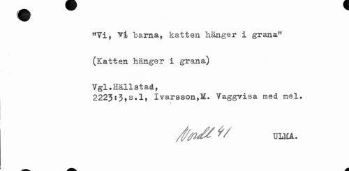 //// "Vi, vi barna, katten hänger i grana" (Katten hänger i grana) Vgl.Hällstad, //// 2223:3,s.l, Ivarsson,M. Vaggvisa med mel. //// /t*»/!*/ //// ULMA. ////